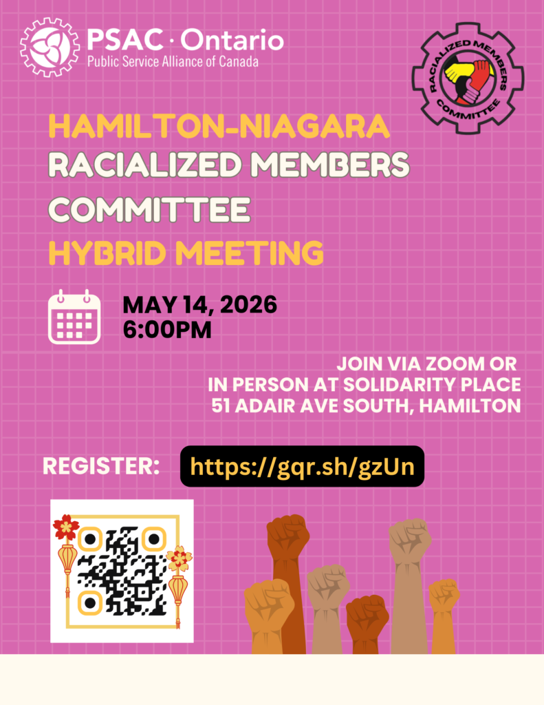 This meeting is open to all PSAC members in good standing in Region 6 (Hamilton-Niagara) who identify as Racialized.