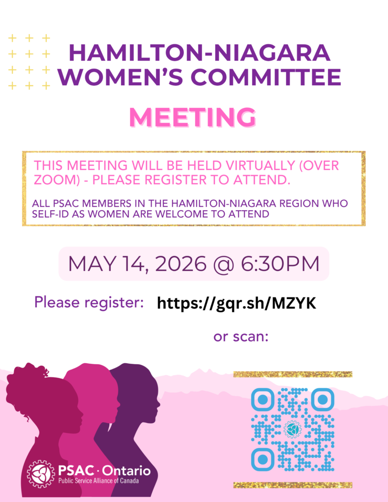 Join us Thursday, May 14th at 6:30pm for a VIRTUAL meeting (over Zoom). All PSAC members in good standing in Region 6 (Hamilton-Niagara), who identify as a woman, are welcome to attend.