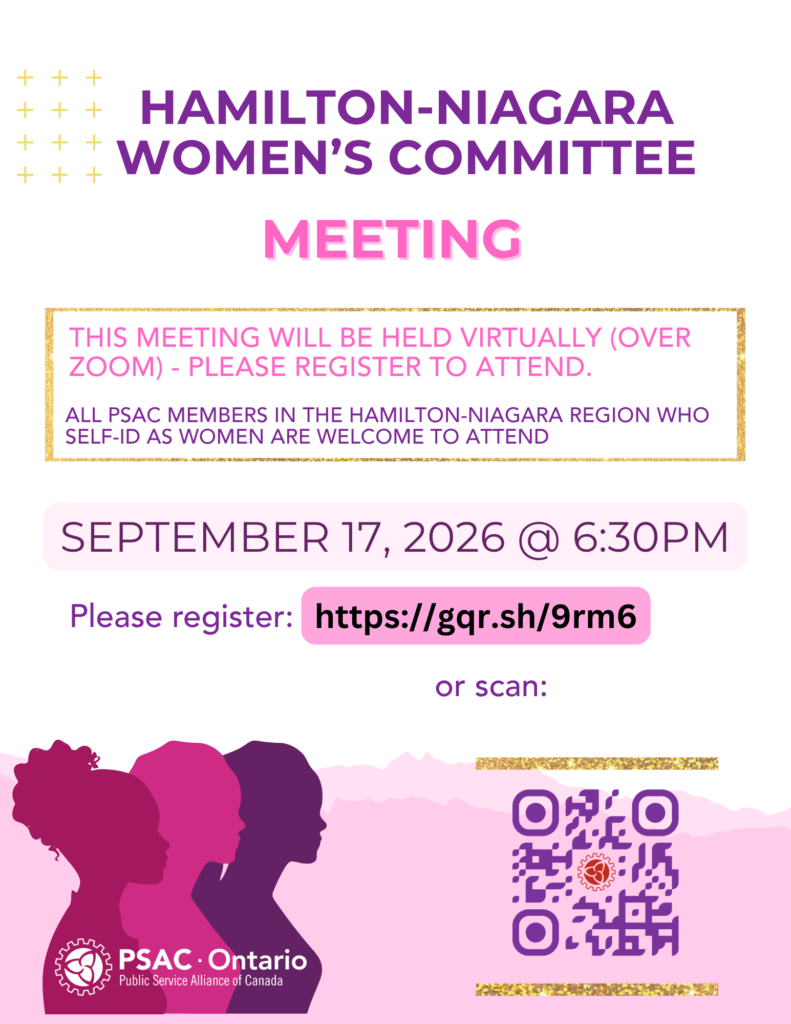 Join us Thursday, September 17th at 6:30pm for a VIRTUAL meeting (over Zoom). All PSAC members in good standing in Region 6 (Hamilton-Niagara), who identify as a woman, are welcome to attend.