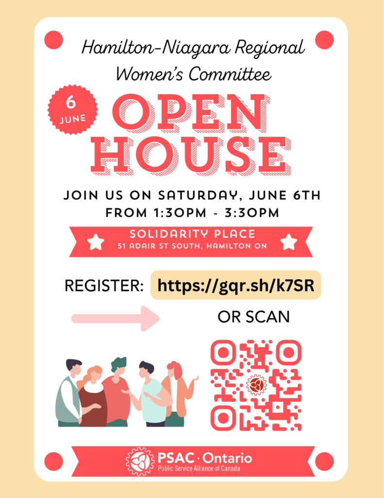 PSAC members in Region 6 (Hamilton-Niagara) are invited to an open house hosted by the Hamilton-Niagara Women’s Committee.