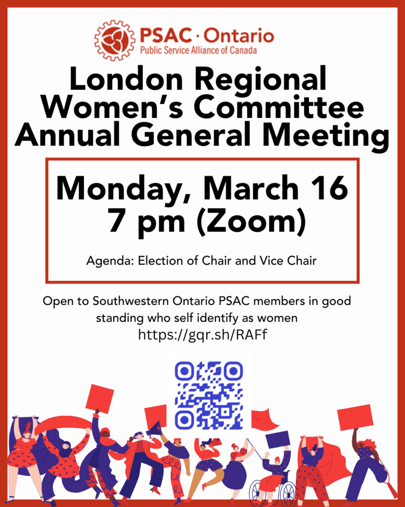 You’re invited to the PSAC London Regional Women’s Committee Annual General Meeting! This meeting is open to all PSAC members in the Southwestern region of Ontario who identify as women.