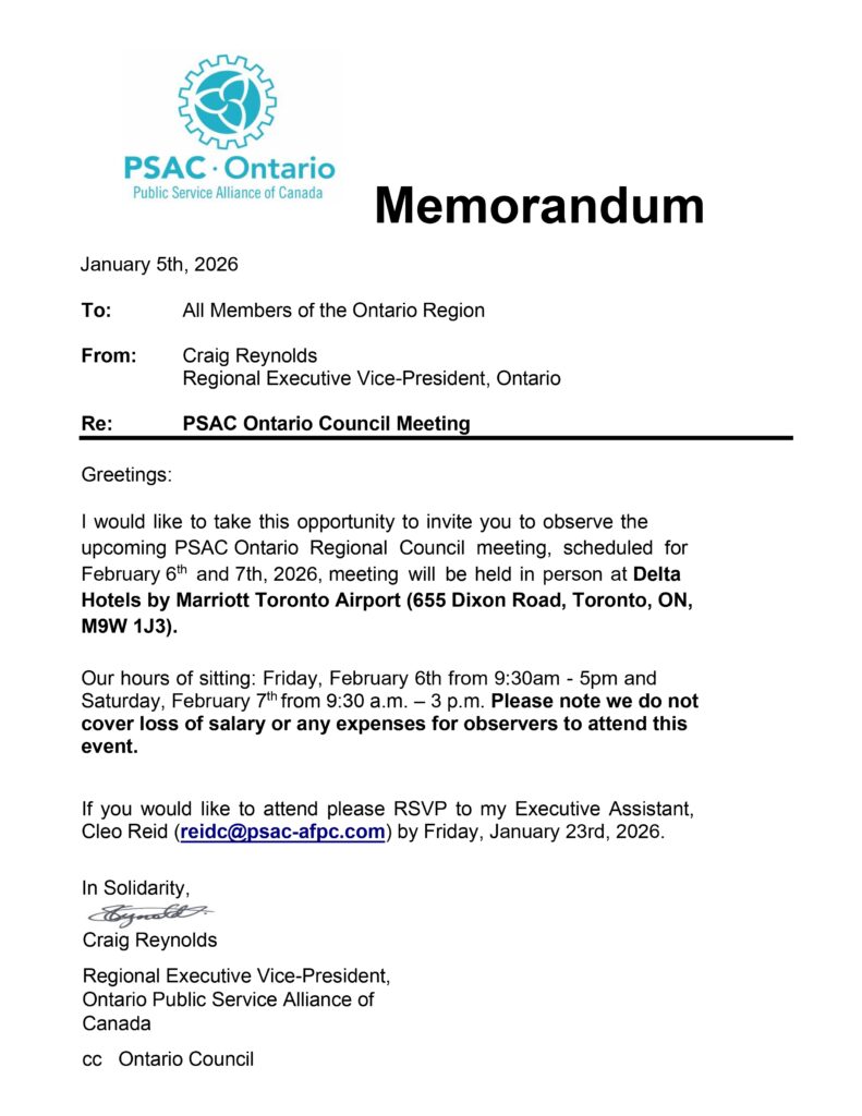 To attend as an observer: RSVP to Cleo Reid (reidc@psac-afpc.com) by Friday, January 23rd, 2026.