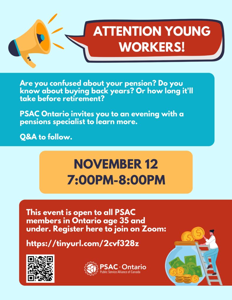 Are you confused about your pension? Do you know about buying back years? Or how long it’ll take before retirement? PSAC Ontario invites you to an evening with a pensions specialist to learn more. Q&A to follow.