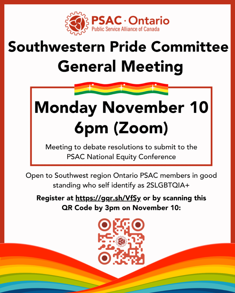- To debate resolutions to submit to the PSAC National Equity Conference. If members are interested in getting involved in drafting resolutions for consideration, get in touch with Chair Kaila Levola (psacsouthwestpridecommittee@gmail.com).
