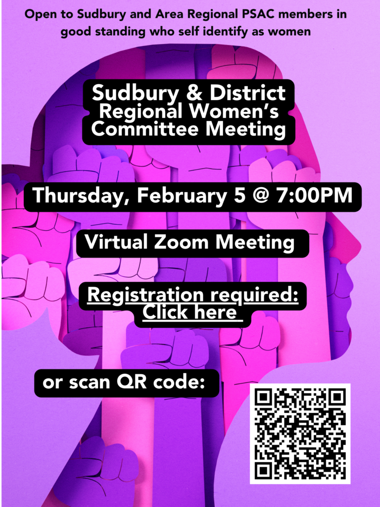 You’re invited to the PSAC Sudbury & District Regional Women’s Committee Meeting! This meeting is open to all PSAC members in the Sudbury & District Regional area who identify as women.