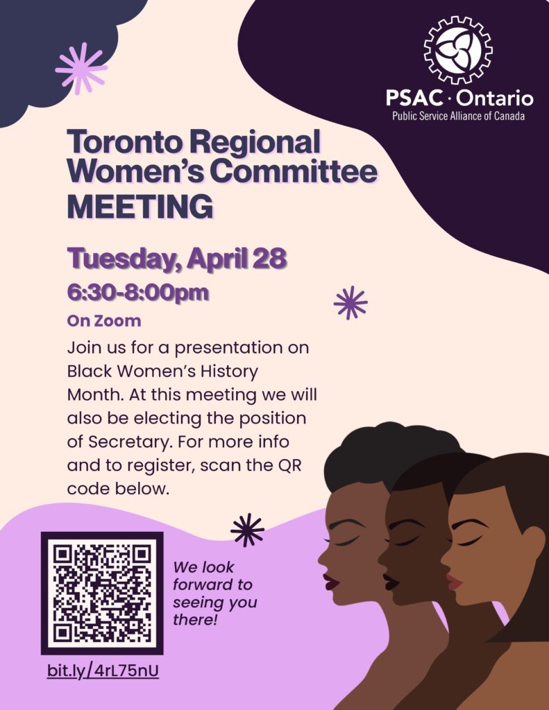 This meeting is open to all PSAC members in the GTA who identify as women. Come and share your voice at the meeting.
